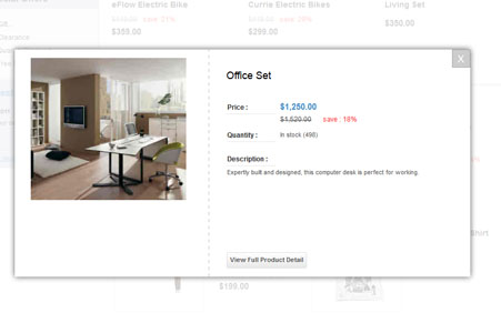 Our Vevocart also provides this feature to let all users facilitate their customers when navigating through a site. The feature is called "Quick View". Quick view button located under the product when using a mouse to hover over a product image.